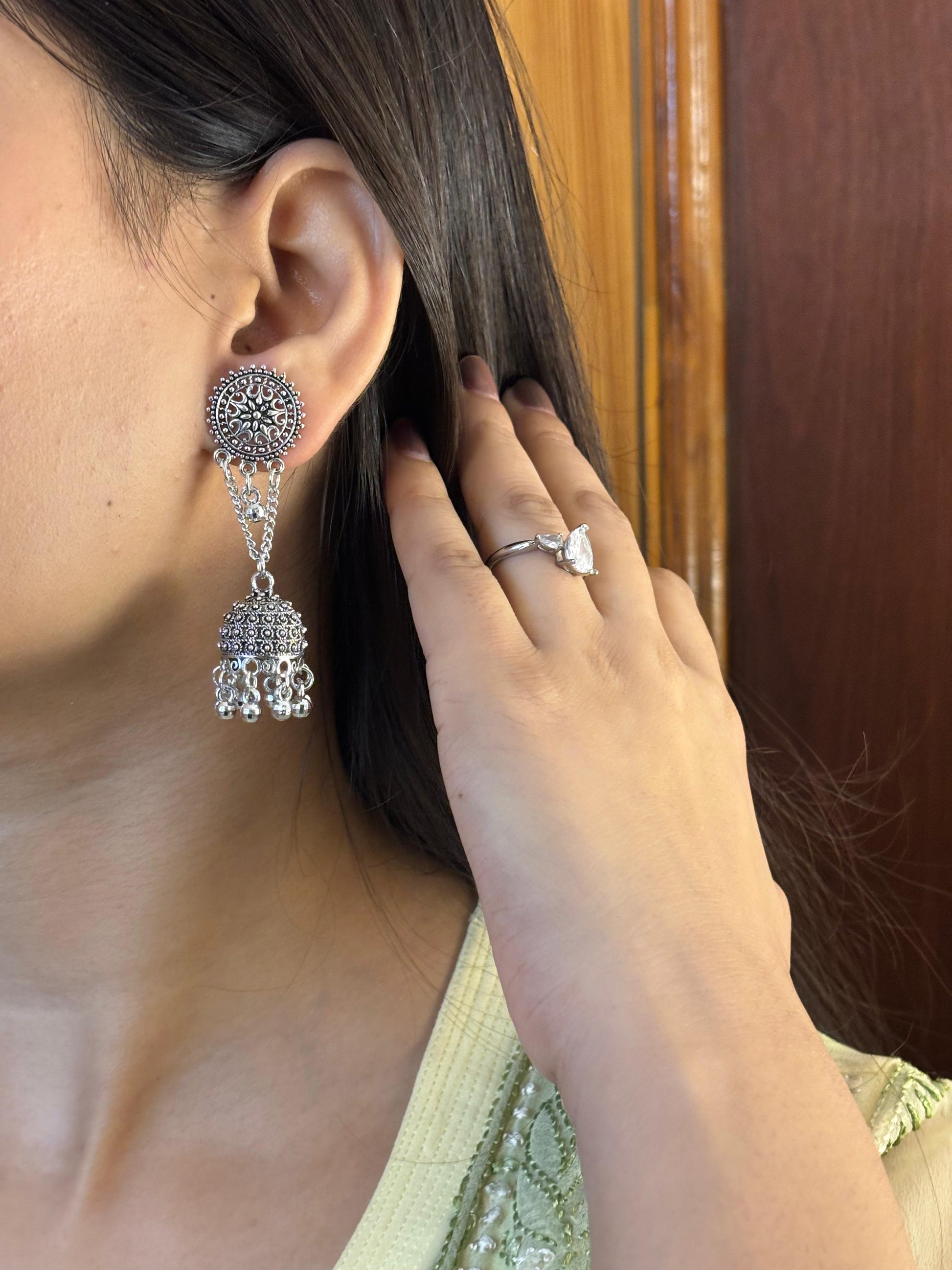 - Silver square & chain jhumka earrings β Square stone stud with chain-linked mini jhumkas.