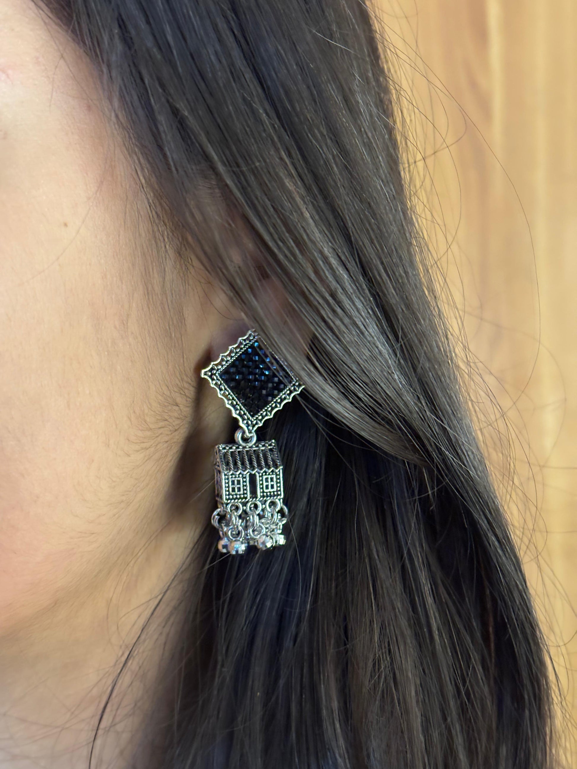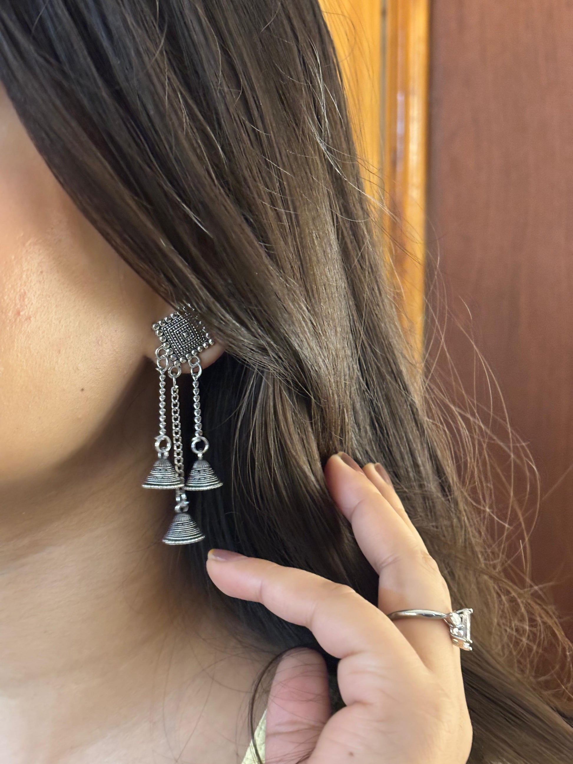- Oxidised square jhumka earrings β Square engraved stud with layered dangling beads.